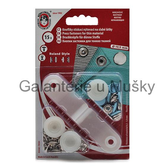 Knoflíky stiskací nýtovací Roland Style Ms v.2 slouží ke spojování jemných a poddajných druhů látek jako jsou froté, úplety, košilovina aj. Druk Roland Style je nýtovací druk s typem vrchního dílu velikosti 10,5/4,3 mm. Balení 15ks/karta.