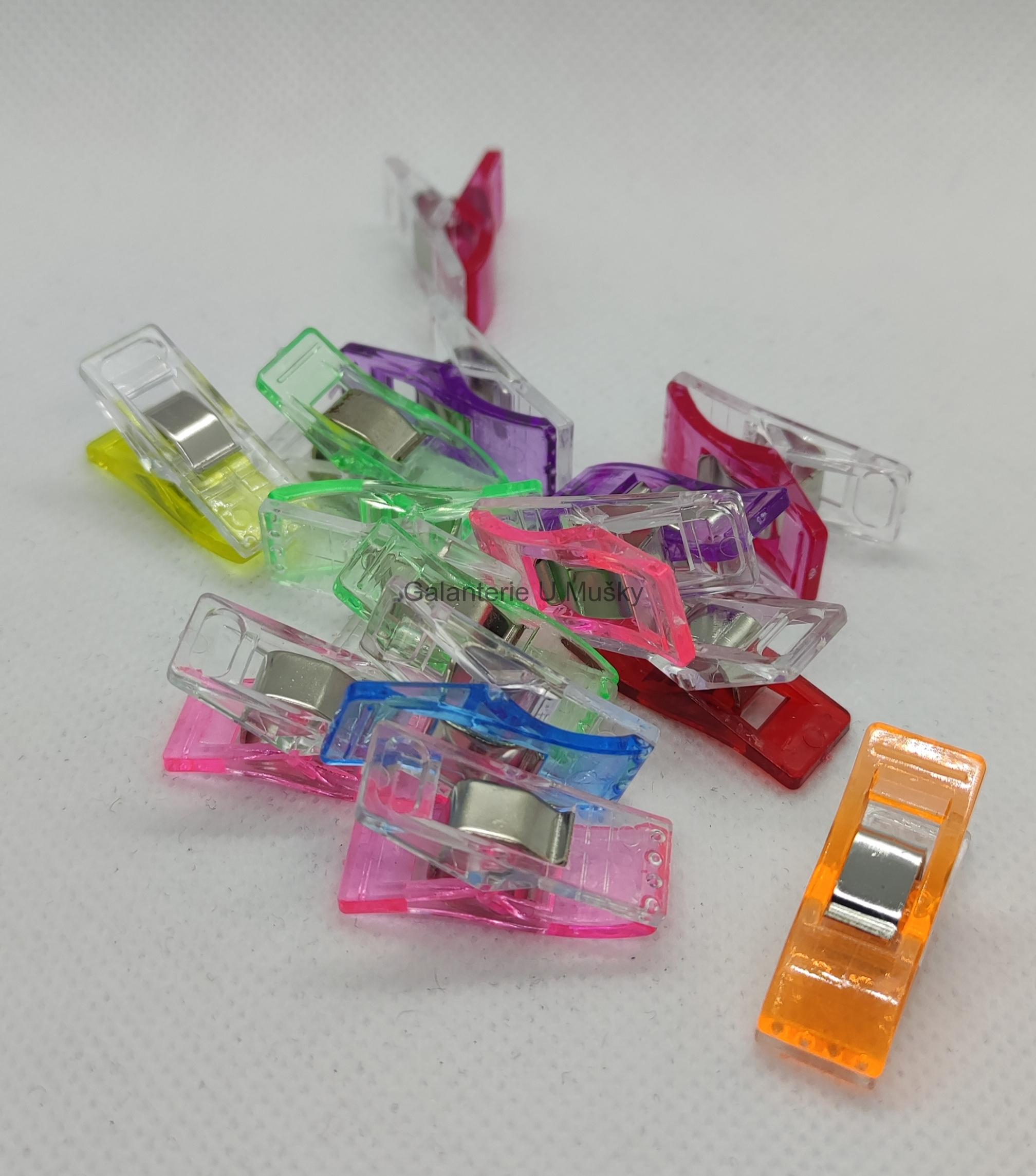 Plastové svorky na textil. Vhodné na patchwork a jiné šicí projekty, při který je třeba sepnout více vrstev. Alternativa ke klasickým špendlíkům, vhodné zejména na jemné materiály nebo kůži, vinyl atd. Velikost 2,5x1 cm. Čínský výrobek, cena za 1 balení.